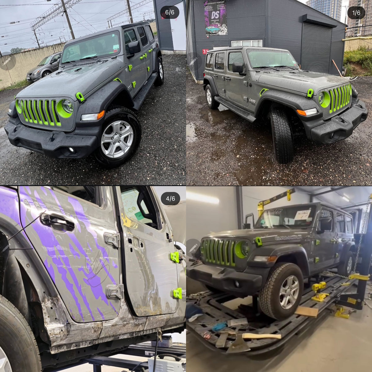 JEEP WRANGLER один из самых сложных наших проектов, ведь ни один элемент который пострадал при ДТП в Америке, на авто не менялся, все элементы мы восстановили и вернули обратно. Сложность работы заключалась в том что двери алюминиевые, и выправка их была довольно таки сложной, порог также остался родной так, как в продаже у нас нету порогов на этот автомобиль и гнуть их еще не научились, а ждать деталь с Америки довольно долго, поэтому было принято решение о восстановлении порога.